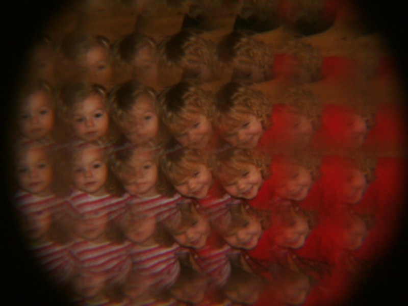 Wirklich lustig wird es, wenn man vor das Objektiv noch ein Prisma hält; in dem Fall ein so genanntes Tigerentenauge. (Eine Linse mit angeschliffenen Facetten). Auf diese Art sieht man in dem Bild links die Paula und rechts die Emma und zwischendrin Weißnicht. :-)