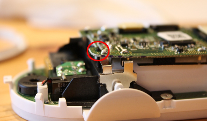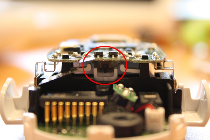 Nach dem Zerlegen anhand von Julians Anleitung konnte ich erkennen, warum meine Maus sich so hartnäckig gegen das Anschalten weigerte: durch die unsanfte Landung hatte sich offenbar das “Mainboard” der Maus aus seinen Schnappverankerungen gelöst; deshalb ließ sich der eigentliche Schalter (rot markiert; in der Bildmitte) auch nicht mehr so gut von außen betätigen.