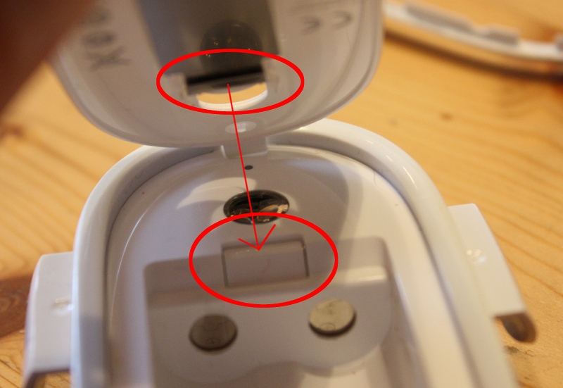 Mit dem Verschieben der Klappe über der Optik biegt man einen Blechstreifen ein, zwei Millimeter in Richtung Batterien, um dort einen Schalter zu betätigen. Offensichtlich reichten diese beiden Millimeter nicht mehr aus; per festem Fingerdruck auf den Schalter oberhalb der Pluspole der Batterien ging gelegentlich noch die Kontrolllampe an, aber arbeiten kann man so ja nicht.