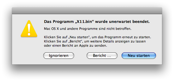 Laut der Apple-Mailingliste kann man das Problem beheben, indem man XQuartz neu installiert. Mal sehen.