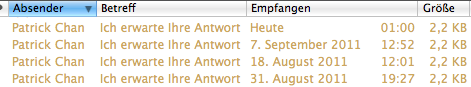 (Gelb sind die Mails übrigens deshalb, weil sie seltsamerweise im Spamordner gelandet sind. Und 1&1 löscht Spam nach ein paar Wochen automatisch, deshalb gibt es auch keine älteren).