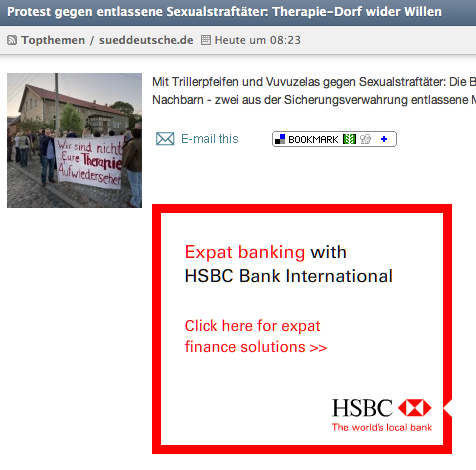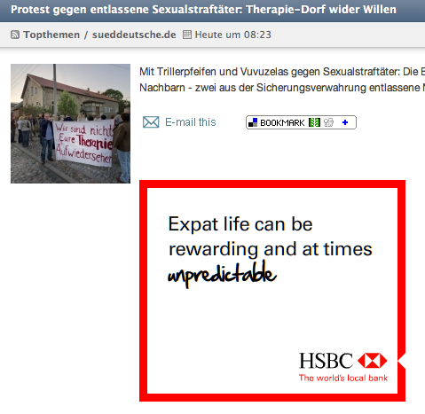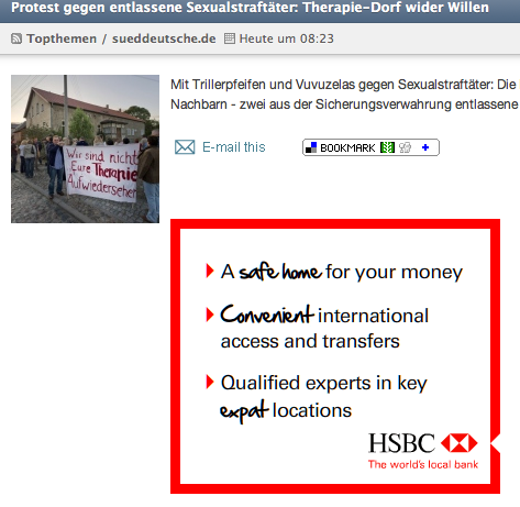 Im RSS-Teaser zu einem Artikel über zwei unwillkommene aus der Haft entlassene Sexualstraftäter macht die Bank HSBC Werbung für ihre Expat-Produkte…