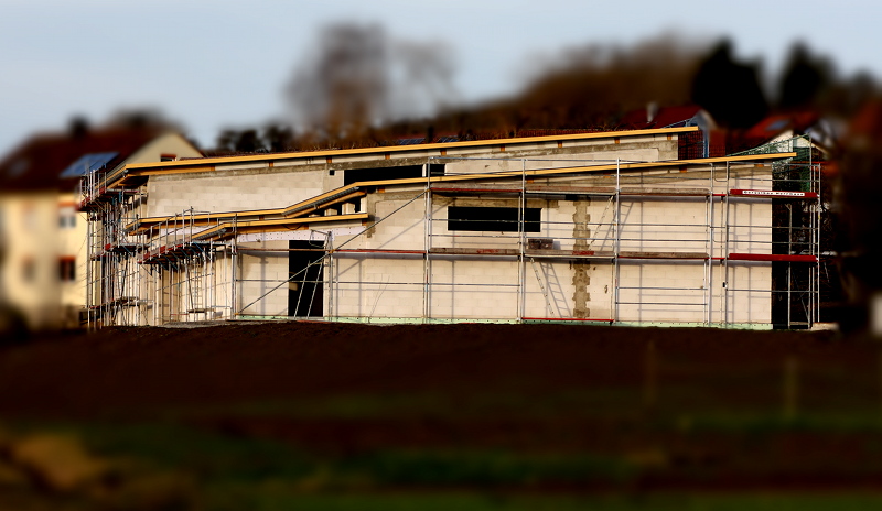 Deshalb steht auch kein Kran mehr auf der Baustelle, nur noch Gerüst. Das Bild zeigt die Ansicht von Osten her. Der ganz niedrige Teil links vorn im Bild wird die Werkstatt & Co. beherbergen, der mittelhohe Teil rechts im Bild ist die Fahrzeughalle mit den fünf Boxen und im Hintergrund ist das zweistöckige Nebengebäude sichtbar. Darin werden sich auch die Ankleiden und der Funkraum und die Gemeinschaftsräume und und und befinden.