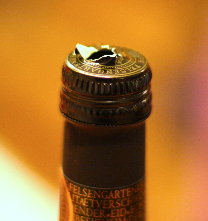 Ihr kennt ja auch alle die Weinflaschen mit dem “Verhüterli” oben drauf, das man je nach Hersteller mal besser und mal schlechter wegkriegt. Manche haben eine Aufziehhilfe, andere muss man ringsrum mit dem Messerchen vom Sommelierbesteck aufritzen, bevor man das Häubchen abbekommt.