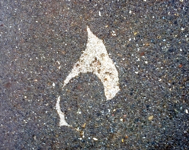 Zur Erinnerung: wir haben originales Sauwetter hier. Also müsste eigentlich alles komplett nass sein. Nichtsdestotrotz sieht man immer wieder solche trockenen Stellen. Meine persönliche Theorie ist ja, dass an dieser Stelle der Asphalt schon so ein paar Löchlein hat und dass bei solchem Wetter der noch warme Boden darunter (der hat immerhin am vergangenen Wochenende doch so ein bissel Sonne tanken können) ein wenig ausgast und so das Sauwetter wegtrocknet. Wissenschon, Anomalie des Wassers und so.
