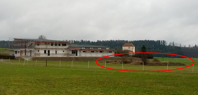 Das waren also (man sieht’s aus dieser Perspektive nicht ganz so toll) drei Erdwälle parallel zum Tempelweg, mit Beton zwischen drin. Da kam die Silage zwischen rein, bis sie so hoch wie die Wälle war und dann die Folie drüber.