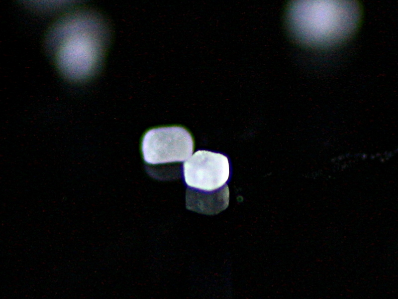 Freilich sind die Körnchen aus dem Supermarkt nicht alle schön kubisch; viele meiner Versuchsbilder zeigen solche mit rund geschliffenen Ecken und Kanten. Aber einige halbwegs scharfkantige habe ich in meiner nicht repräsentativen Stichprobe dennoch gefunden.