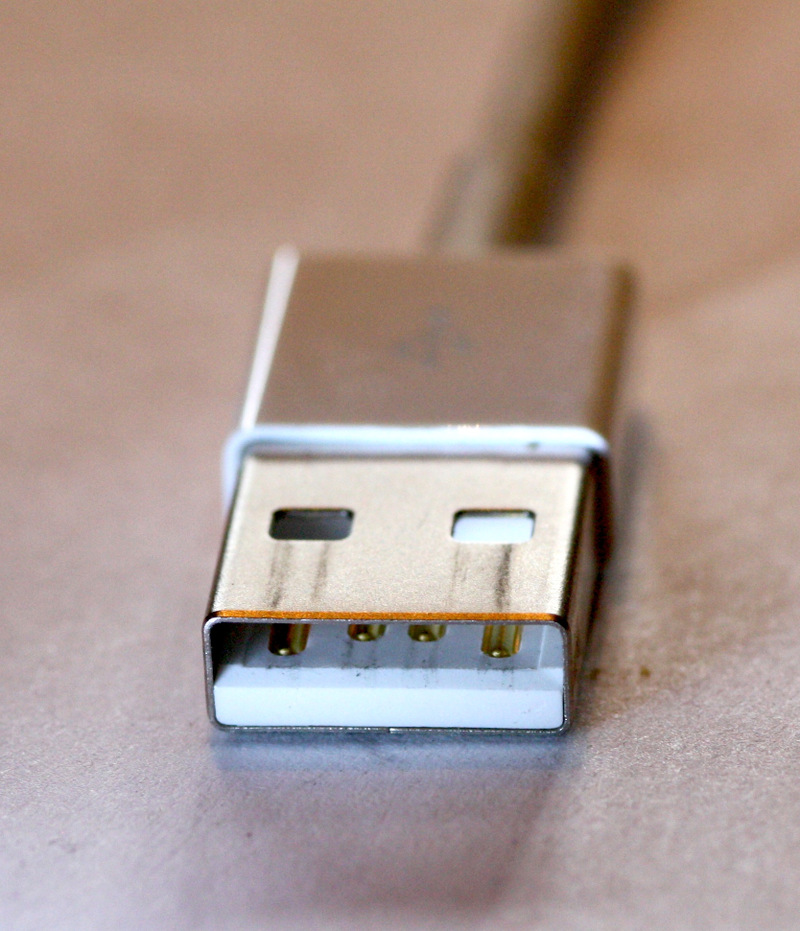 Sehr schön zu sehen ist auf dem zweiten Foto auch, dass die beiden äußeren Kontakte länger sind als die beiden mittleren. Auf denen liegt die Versorgungsspannung (links ist Masse, rechts ist +5V). Da sie länger sind, bekommen sie beim Einstecken zuerst Kontakt. Das angeschlossene Gerät hat dann eine Chance, die Datenleitungen (in der Mitte) auf sinnvolle Pegel zu bekommen.