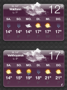 Auch auf dem Mac-Dashboard machte sich ein zweites Wetterwidget immer gut, denn dann konnte man immer mal nachschauen, wie gut wir es eigentlich (trotz Scheißwetter) haben, weil es in Werchojansk einfach nochmal 30 oder 40 Grad kälter war.
