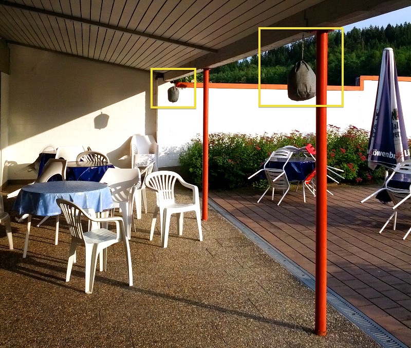 Natürlich hab ich den Bademeister gefragt, was das für Dinger sind, und ich habe erklärt bekommen, dass es sich dabei um Wespennestattrappen handelt. Das sind tatsächlich schlicht graue Textilbeutel mit Stopfmaterial drin.