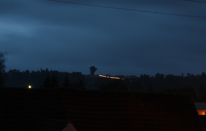 Damit kann man also beispielsweise Langzeitaufnahmen machen, die auch über die 30 Sekunden hinaus gehen, oder mit ziemlich geschlossener Blende und dem Weitwinkel gegen den Himmel knipsen und erst loslassen, wenn sich ein Blitz gezeigt hat. Blitze habe ich gestern leider keine erwischt; die haben sich dezent in den Wolken versteckt. Aber ich habe dafür herausgefunden, dass ich mit meiner Kamera (zumindest bei ISO 400) nicht anfangen brauche, den Sternenhimmel knipsen zu wollen, weil die Ergebnisse so einige Astronomen durcheinander bringen dürften: