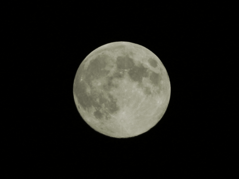 Aber dann ging’s ja direkt weiter, weil so ein Vollmond ist ein Sauhund, der jegliche Automatismen der Kamera schonungslos und im Galopp über sämtliche zur Verfügung stehende Klippen jagt. Der Vorschlag vom Gerät (mit mittenbetonter Messung) wäre gewesen, die Blende ganz aufzureißen (f/5.6) und dann 1/25 Sekunde lang zu belichten. Zugegeben, auf solchen Bildern sieht man durchaus, dass da jemand versucht hat, den Vollmond abzulichten, aber schön wird das nicht, weil der Trabant komplett überstrahlt …