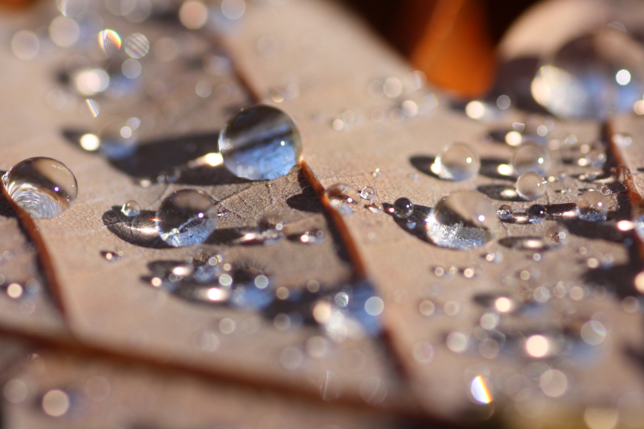 Viele Roteichenblätter fallen wie Nutellabrote auf ihre Oberseite(*). Die Unterseite der Blätter wollte aber (wegen hydrophob) den Regen und den Tau nicht so wirklich annehmen, sodass ich ein paar richtig schöne Wassertropfenfotos machen konnte. So wie das hier: