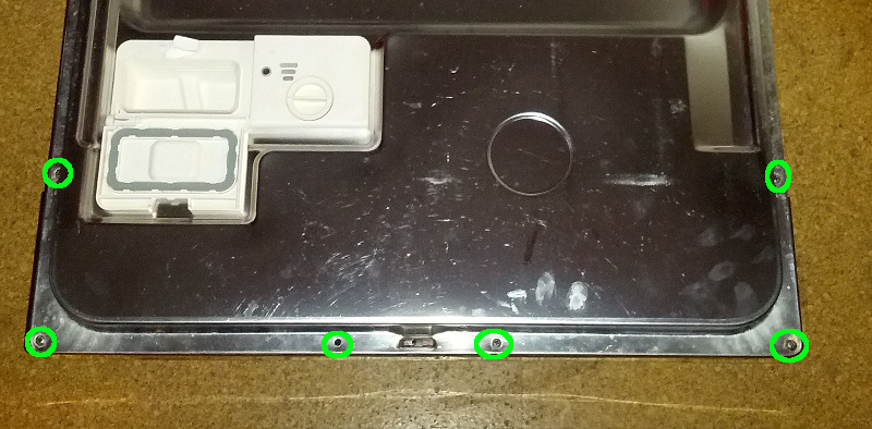 Zuerst bewaffnet man sich mit einem ordentlichen (!) Kreuzschlitzschraubendreher. Dann sagt man zur Spülmaschine “soooo, schön weit aufmachen” und schraubt diese Schrauben hier raus: