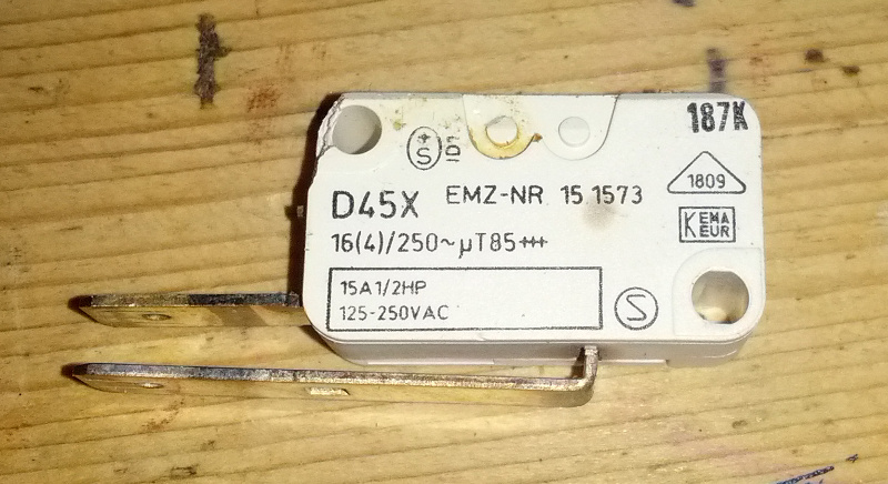 In meiner Maschine ist ein Mikroschalter vom Typ D45X verbaut, der Hersteller ist Cherry (ja, die, die auch die Tastaturen bauen). Prinzipiell geht an dieser Stelle auch jeder andere Mikroschalter, sofern er a) dieselbe Stromstärke verträgt und b) (ganz wichtig) so lange Anschlussfahnen hat wie das Original. Weil die werden ja durch das rotbraune Plastiktrumm durchgesteckt. Egal ist hingegen, ob der Schalter zwei oder drei Anschlussfahnen hat, wenn man denn die richtigen beiden anschließt.