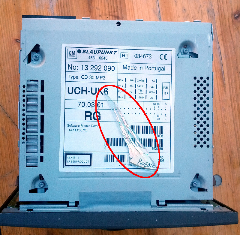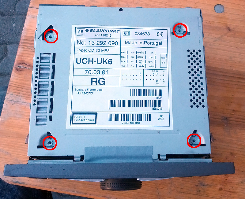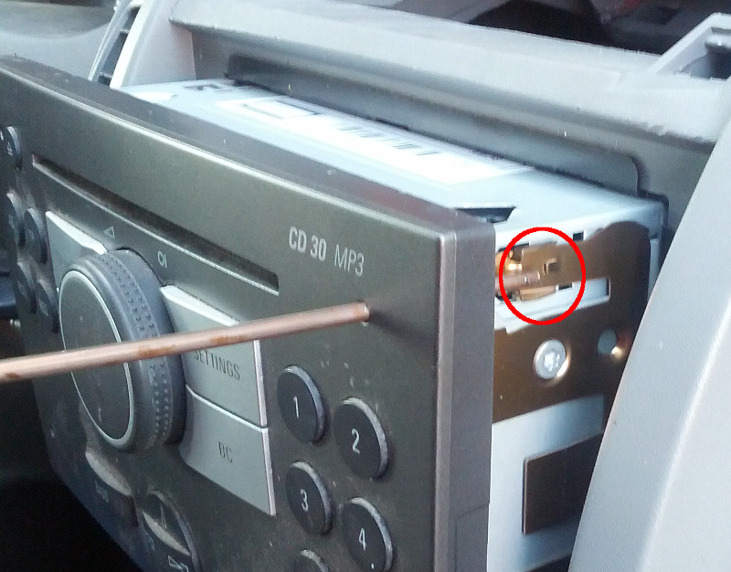 Am Anfang steht der Ausbau. Der ist bei Opels eigentlich durchweg gleich. Das Gerät hat in den Ecken Löcher, und diese verwendet man, um die Sperrriegel zu entsichern, die das Radio links und rechts im Käfig halten. Ich habe dafür einen dickeren Schweißdraht verwendet, Stricknadeln dürften auch gehen. Oder man kauft sich “richtiges” Werkzeug. Wichtig ist auf jeden Fall, dass der Draht nicht zu dünn ist; er sollte recht stramm passen, sonst kriegt man das Radio nicht so leicht raus. Ich habe in folgendem Bild mal markiert, wie man mit dem Draht den Sperrriegel betätigt.