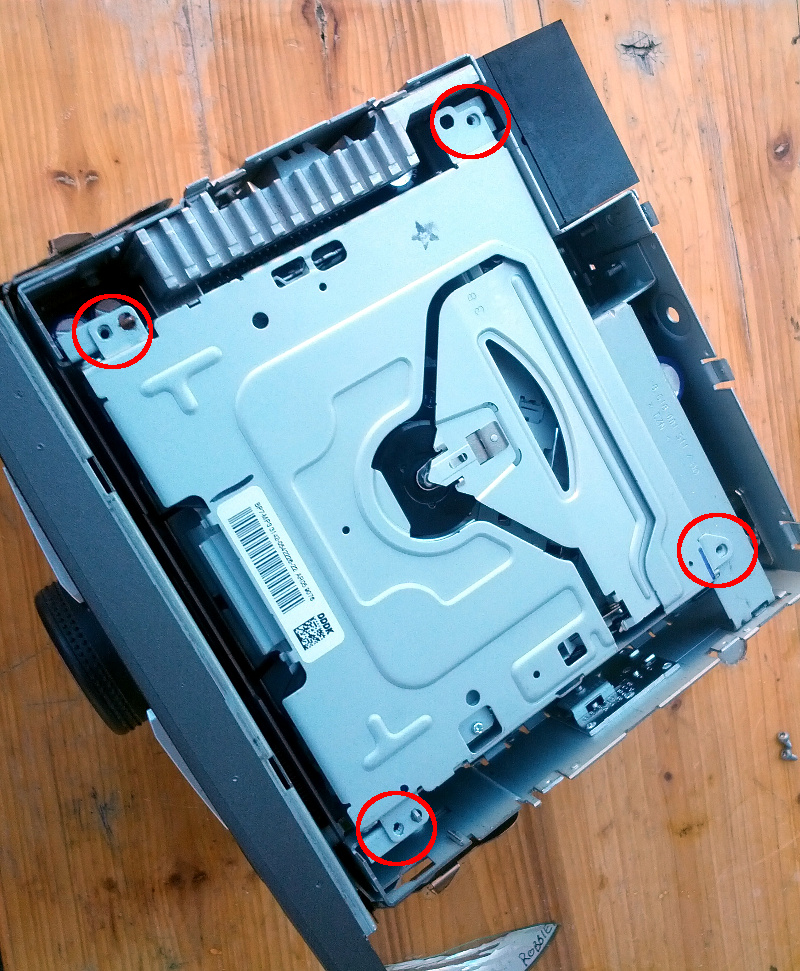 Als nächstes muss das Laufwerk raus, entweder um Fremdkörper entfernen oder um es tauschen zu können. Also nochmal vier Schrauben raus, nämlich die eingekreisten im folgenden Bild: