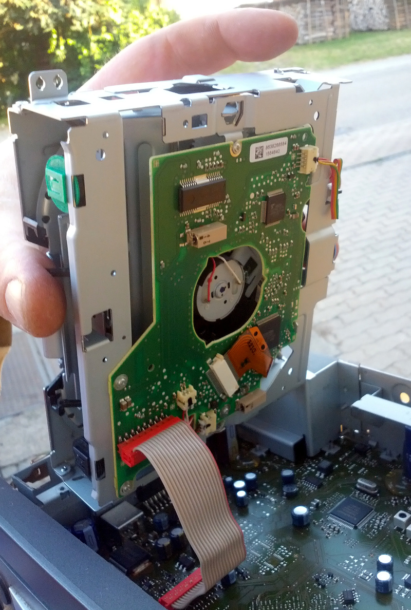 Jetzt lässt sich das Laufwerk aus dem Radio herausheben, wobei auf das Flachbandkabel zu achten ist. So ein Autoradio ist wahrlich kein Mobiltelefon oder Laptop, sodass man hier nicht wirklich viel kaputt machen kann. Aber mit roher Gewalt schafft man ja alles, siehe den Grund für diesen Beitrag.