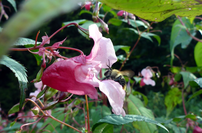 An einer Stelle am Waldrand gibt es Drüsiges Springkraut, auch Indisches Springkraut genannt. Ich habe mich über die knalligen Farben gefreut und dass so viele Hummeln dort emsig am Arbeiten sind. Die Wikipedia sagt aber, dass man stattdessen die Pflanze lieber bekämpfen sollte. Googelt man “Indisches Springkraut”, dann stößt man auf Seiten, die von einem “stark invasiven Problem-Neophyt” berichten. Die Hochschule Rottenburg titelt gar “Das Indische Springkraut und die grauenhaften Folgen”.