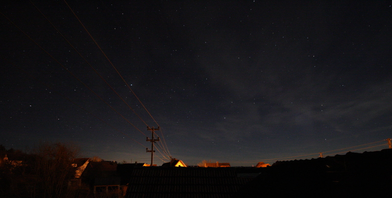 Hier mal mein erster Versuch von heute früh: der östliche Nachthimmel kurz vor Sonnenaufgang (bitte aufs Bild draufklicken; dann sieht man auch die Sternchen):