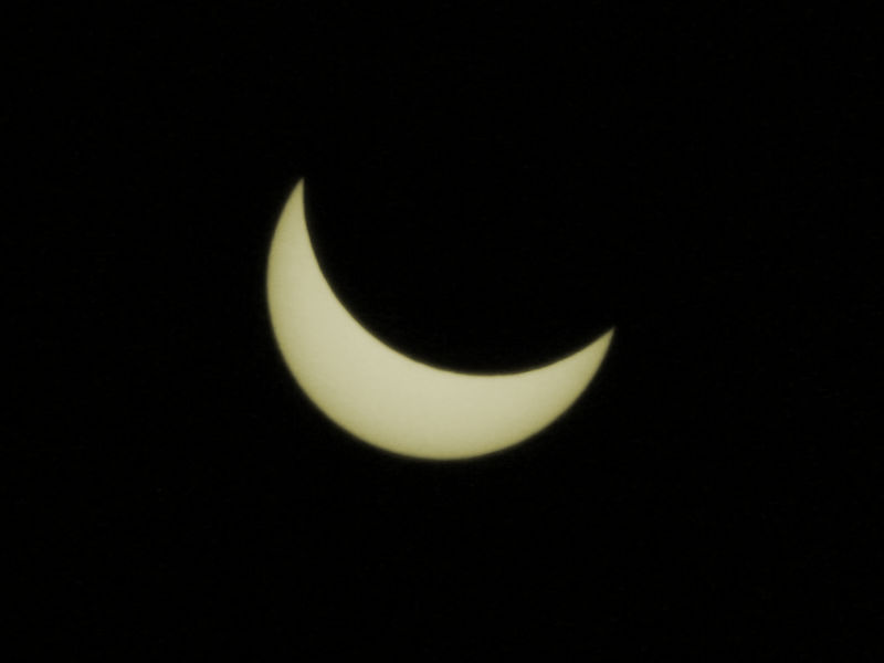 Heute früh war ja eine deftige teilweise Sonnenfinsternis. Ich habe meinen variablen ND-Filter ganz zu gedreht und auf das gute alte 200er Tele draufgeklebt (mit Tesa), ISO auf 100, Belichtungszeit auf 1/4000 und mit der Blende zwischen 18 und 28 (ganz zu) gespielt.