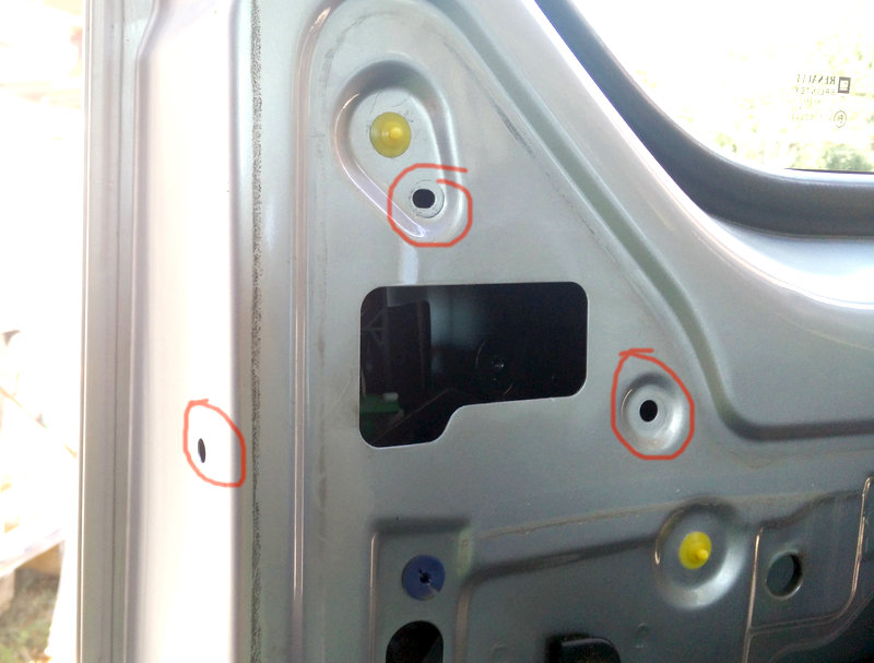 An die Mutter des Gewindebolzens vom äußeren Türgriff kommt man nun nämlich immer noch nicht dran. Dazu muss erst noch die Betätigungsmechanik aus dem Weg geräumt werden. Das geht genau dann, wenn man die drei Schrauben löst, die an den markierten Stellen sitzen: