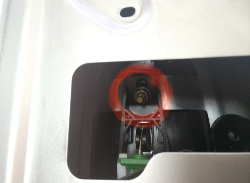 Nun kann man die Betätigungsmechanik vorsichtig nach unten lupfen (sie hängt immer noch an ein paar Zügen) und in dem frei werdenden Loch im Blech kommt man dann endlich an des Übels Wurzel: