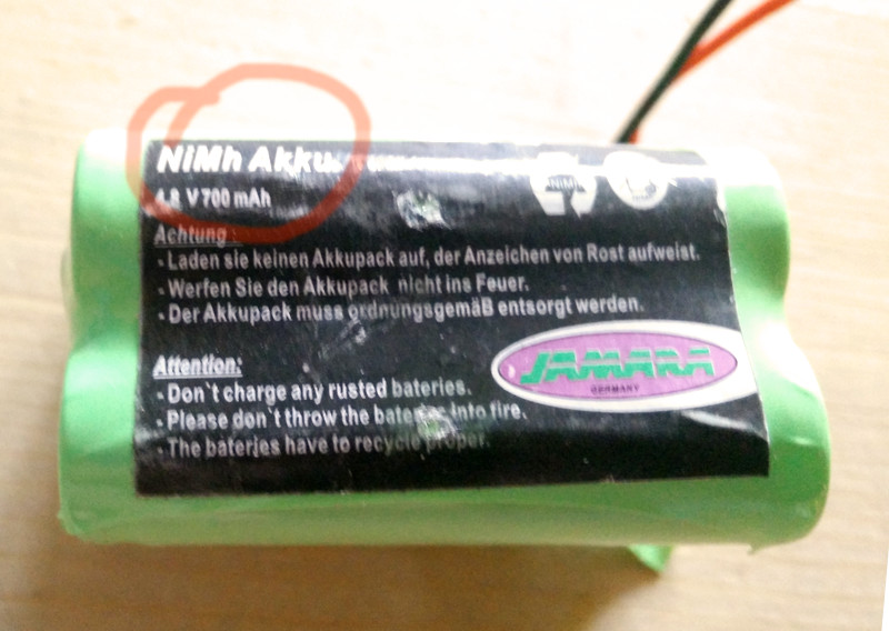 Ich hab also kurzerhand beim Elektroversand meines Vertrauens vier AA-Ready-To-Use-NiMH-Zellen mit Lötfahnen bestellt und dem Junior einen neuen Akku zusammengebrutzelt. Bei der Gelegenheit habe ich dann auch entdeckt, dass die Litze am Minuspol des Original-Akkus über die komplette Länge schwarz angelaufen war. Womöglich hat das auch zur geringen Lebensdauer beigetragen.