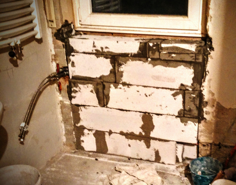 Dem voran ging ein kleiner Installations-Unfall, aus dem mir mein Vater bravurös und dankenswerterweise herausgeholfen hat. In der Mauer stecken nämlich Halbzollrohre, die ich mit den bisherigen Heizkörperanschlüssen auf der rechten Seite der Nische verschraubt habe. Für einfacheres Arbeiten hat mein Dad dort nach dem Abstellen der Heizung und der Demontage des alten Heizkörpers schlicht Kugelhähne montiert. Nun ist es bei Rohrverschraubungen ja so, dass man die erstmal ordentlich einhanft, dann grob festzieht und dann die endgültige Richtung per “drehen wir noch eine halbe Umdrehung weiter” festlegt. Bei den normalen Halbzollmuffen mag das ja gehen, aber nicht bei allen Kugelhähnen (beziehungsweise nicht bei allen Einbaulagen derselben).