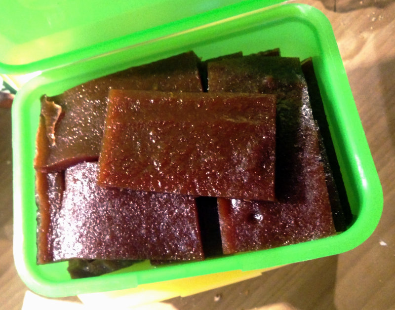 Das Quittenbrot ist ein “Abfallprodukt” von meiner Quittengeleeproduktion. Dazu nimmt man die Pampa, die beim Gelee machen übrig bleibt (minus Kerngehäuse), haut nochmal dasselbe Gewicht an Zucker rein und streicht das Zeugs auf einem Blech aus. Das lässt man über mehrere Tage bei Raumtemperatur oder mehrere Stunden bei ca. 100°C im Backofen trocknen.