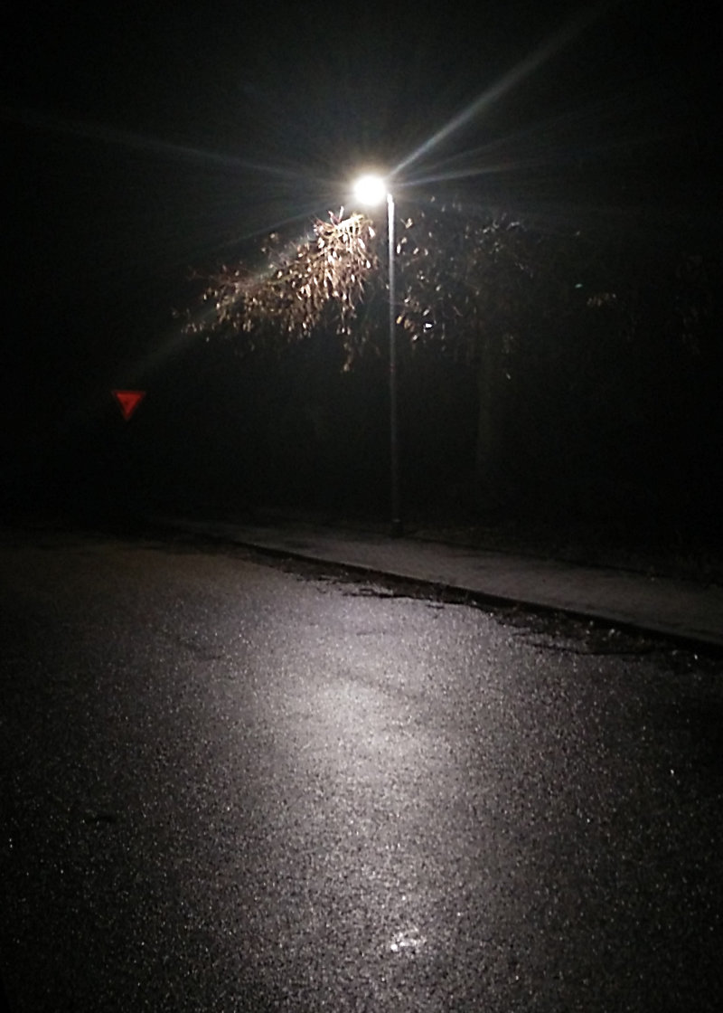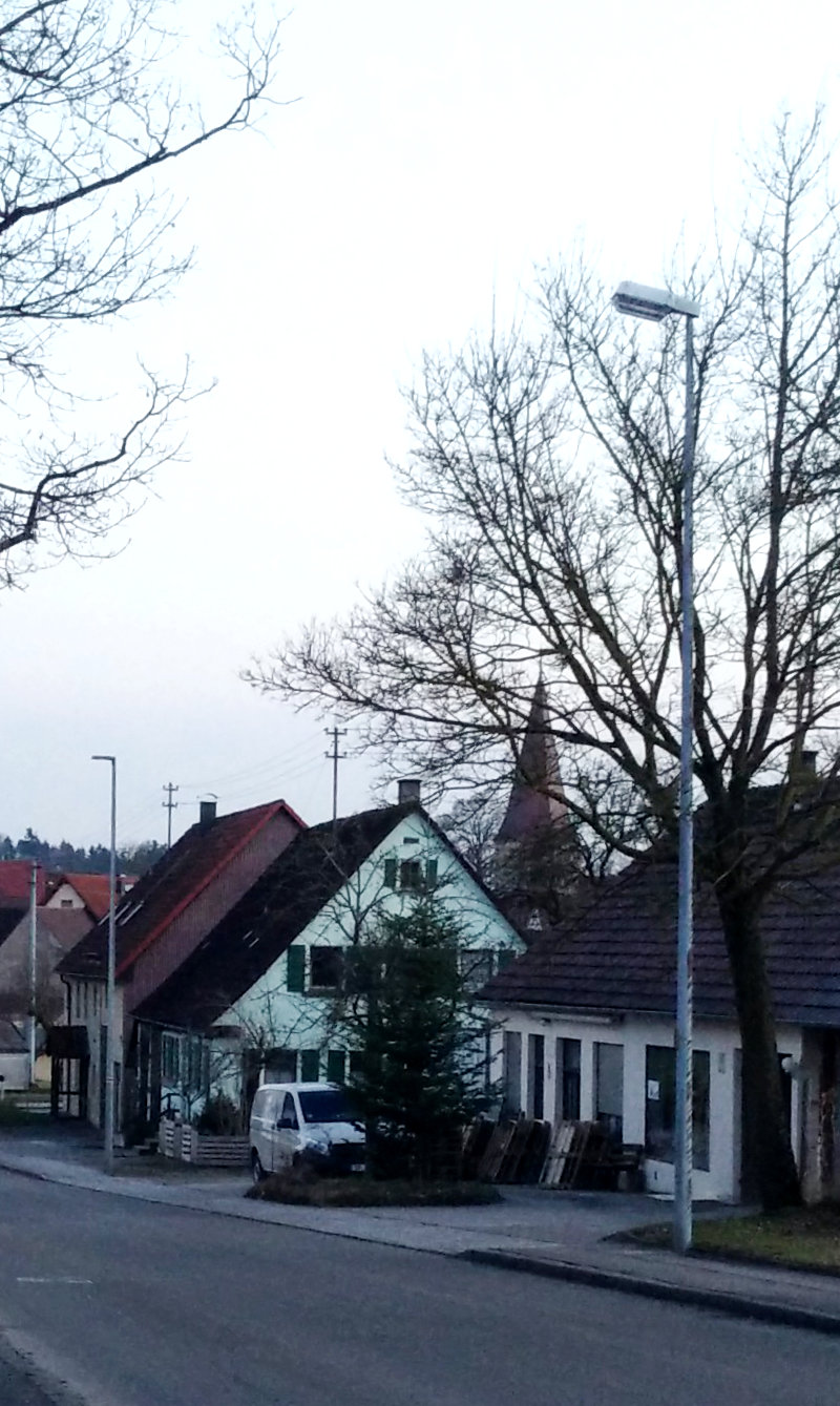 LEDs finde ich ja an sich so schlecht nicht, die sind allemal besser als umwelttechnisch bedenkliche Energiesparlampen. Aber man kann mit LEDs auch so einiges falsch machen, angefangen bei der Lichttemperatur über die Stromversorgung mit „schlechten“ Vorschaltgeräten und dadurch auftretendem Flimmern, mangelnder Kühlung bis hin zu unpassender Ausleuchtung. Meine Überzeugung ist, dass genau letzteres hier in Marktlustenau geschehen ist. Die neuen „Köpfe“ der umgerüsteten Straßenlampen sind sehr klein. Sie machen wahrscheinlich unten auf der Straße genauso hell wie die alten Lampen; das hat sicherlich irgendwer auch ausgerechnet. Aber sie haben keine Streuscheiben, und das ist in meinen Augen (sic!) ein No-Go. Die Dinger blenden nämlich fürchterlich, wenn man daran vorbei fährt. Und dadurch scheint es zwischen den Straßenlampen umso dunkler zu sein.