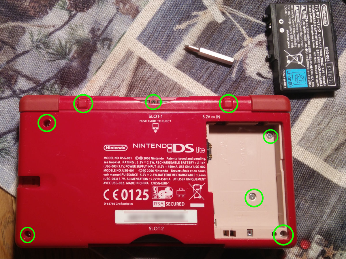 Nicht alle Schrauben des Nintendo DS sind direkt erreichbar, und den Tri-Wing braucht’s auch nur für die beiden Schrauben links (mit den offenen Gehäuselöchern) und die eine schwarze Schraube im Slot-1 (oben).