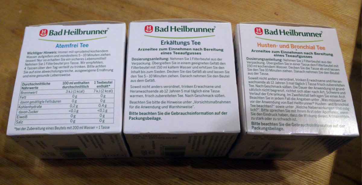 So muss der linke Tee unbedingt mit sprudelnd kochendem Wasser aufgegossen werden. Dieser Hinweis fehlt bei den anderen beiden Sorten. Den mittleren Tee soll man mit kaltem (!) Wasser aufgießen und dann “das geeignete Gefäß” bis zum Kochen des Wassers erhitzen. Die Sorte auf der rechten Seite wiederum darf “normal” in einer Tasse mit kochendem Wasser aufgegossen und dann abgedeckt werden.