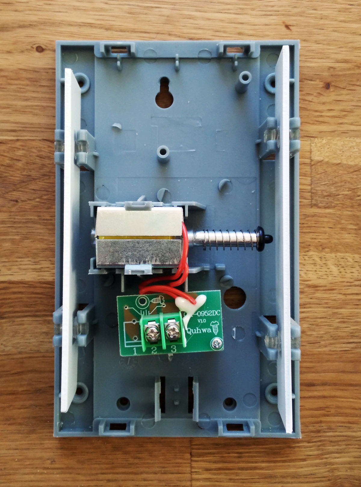 Als Türklingel habe ich bei uns so einen schicken Zweitongong (”Ding - Dong”) installiert. Der sieht offen so aus: