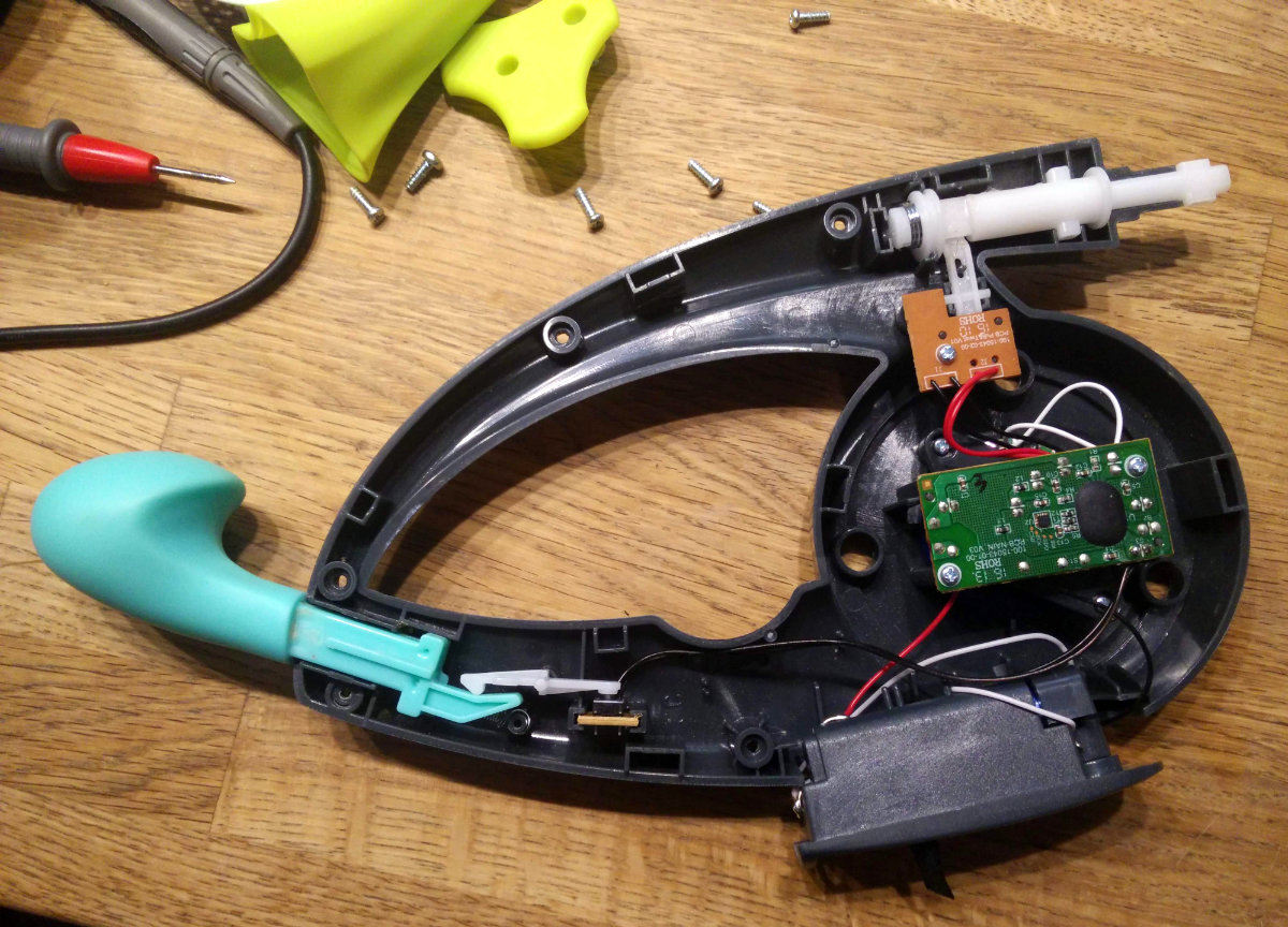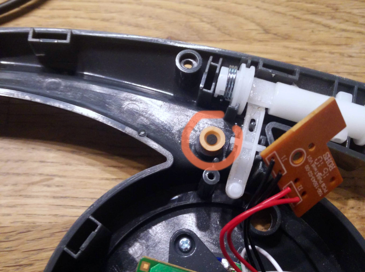 Das Fehlerbild bei uns war, dass sich das Gerät nicht mehr einschalten ließ. Das geht normalerweise mit dem türkisfarbenen “Zieh-Ding”, aber bei uns eben nicht mehr. Das Gerät hat sich aber direkt eingeschaltet, wenn ich den Taster mit dem Fingernagel betätigt habe, also habe ich erstmal wieder zu geschraubt. Aber wenn der Mikrotaster sich über die Umlenkhebelei nicht betätigen lassen mag, schraubt man eben auch gleich wieder auf …