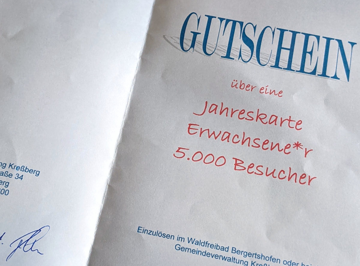 Und dafür schenkt mir die Gemeinde Kreßberg einen Gutschein für eine Jahreskarte!