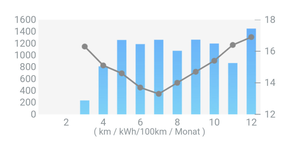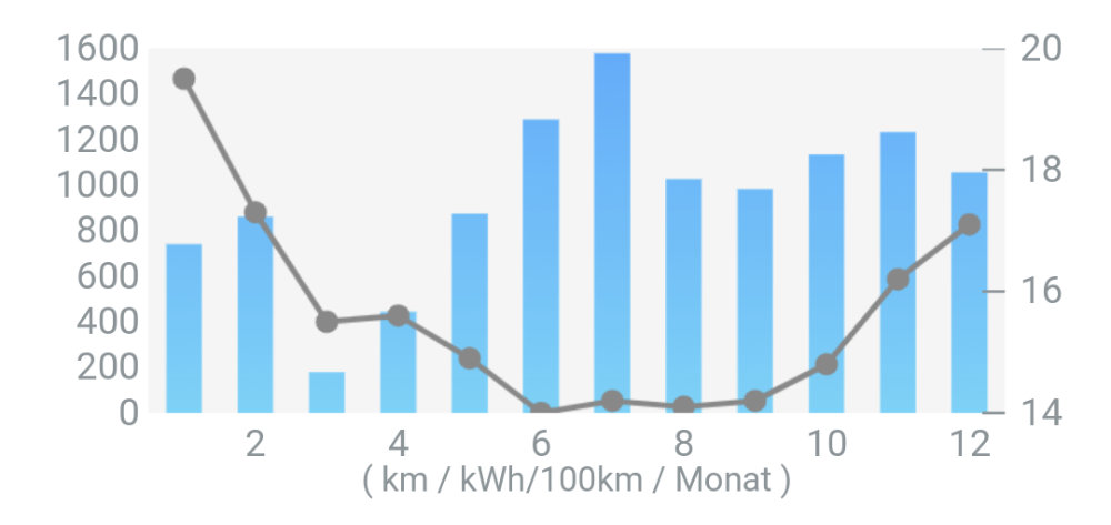 Die blauen Balken repräsentieren die monatliche Fahrstrecke; da gehört die Skala auf der linken Seite dazu. Die graue Linie zeigt den Durchschnittsverbrauch in Kilowattstunden auf 100 Kilometer.