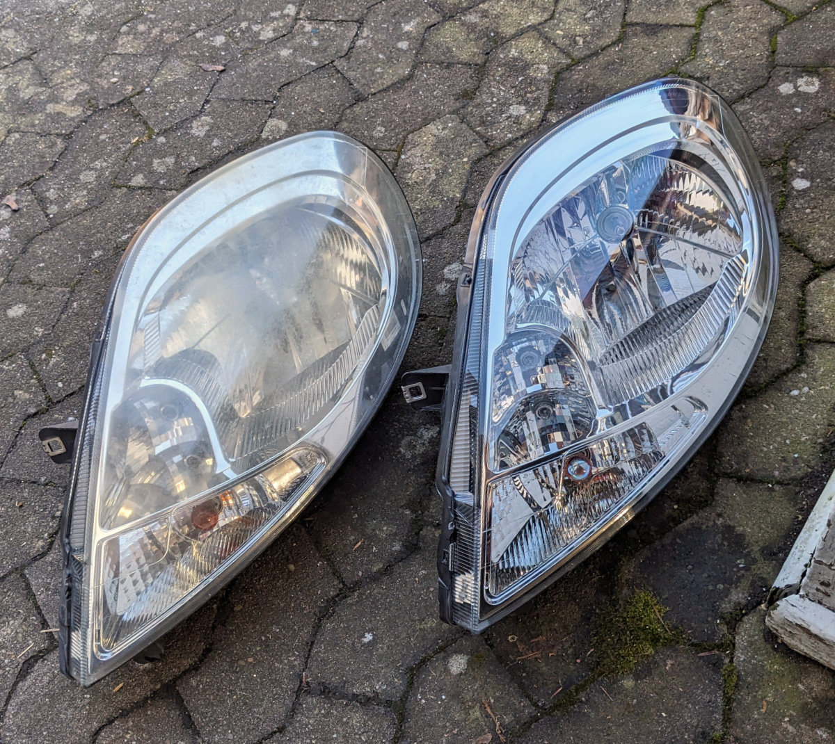 Nun hat der Wagen frische Valeo-Scheinwerfer in Erstausrüsterqualität. Und weil ich bei der Gelegenheit auch Marken-H4-Glühlampen eingebaut habe, sieht man nun Nachts wieder vorzüglich.