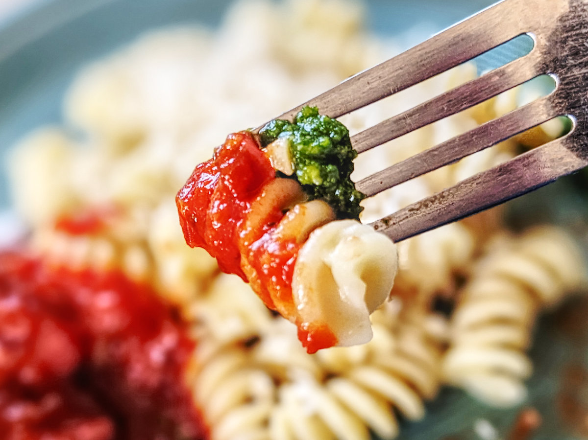 Aber mal was ganz anderes: das Bild oben zeigt Bärlauchpesto, Spirelli und Eigenbau-Tomatensoße.