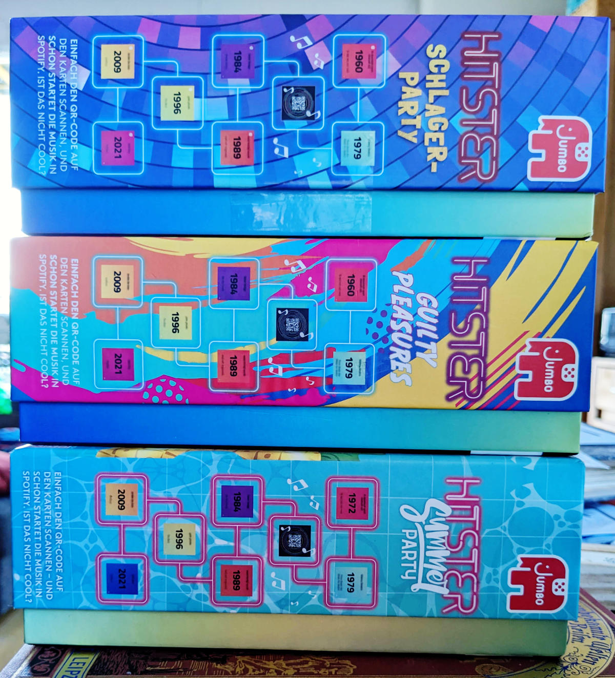 Man startet mit drei aufgedeckten Karten. Gespielt wird reihum. Sobald der Code per Handy gescannt wurde, wird das gesuchte Lied gestreamt. Dann muss man entscheiden, wie das Lied zeitlich einzuordnen ist. Dann dreht man die Karte um. Wenn man richtig liegt, darf die Karte liegen bleiben, ansonsten muss man sie auf den Ablagestapel legen. Wer als erster 7 weitere Lieder eingeordnet hat (also insgesamt 10 Karten vor sich liegen hat), hat gewonnen. Der besondere Gag kommt als Papp-Münze “Hitster”. Wenn gerade jemand anderes dran ist, man aber glaubt, das Lied selbst einordnen zu können. darf man eine dieser Münzen in den Ring werfen. So kann man zum Einen seine eigene Führung ausbauen und zum Anderen verhindern, dass der Mitspieler Punkte bekommt.
