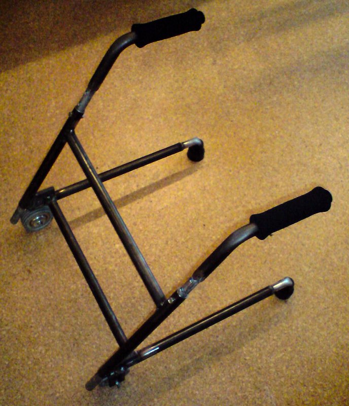 Genau letzterer ist bei uns in der Region (und auch wohl generell, wie uns die Physiotherapeutin versichert hat) nur sehr schwer zu haben; die Sanitätshäuser, die wir kontaktiert haben, sprachen von mehreren Wochen Lieferzeit. Deshalb habe ich mich gestern nachmittag in der Werkstatt verkrochen und habe einen Rollator für Emma selbergebaut. Auf dem Foto sieht man den Rohbau, ich muss die Schweißnähte noch verschleifen und etwas Lack draufklatschen.