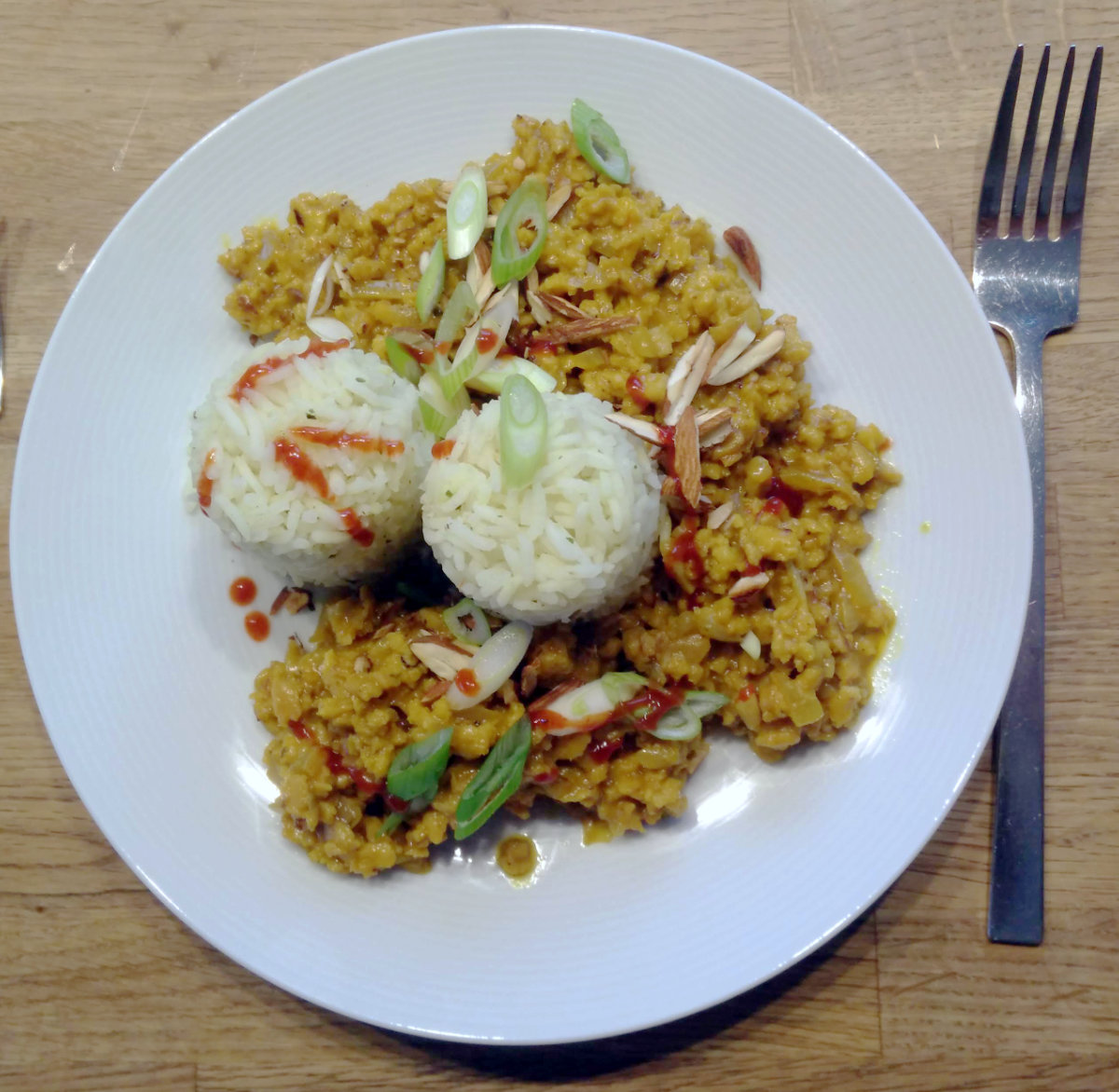 Und weil ich grünen Koriander nicht abkann, habe ich zu den Mörser-Gewürzen getrockneten Koriander dazu und eine kleingeschnittene Frühlingszwiebel oben drauf. Die Mandeln habe ich längs gehackt und mit etwas Salz geröstet.