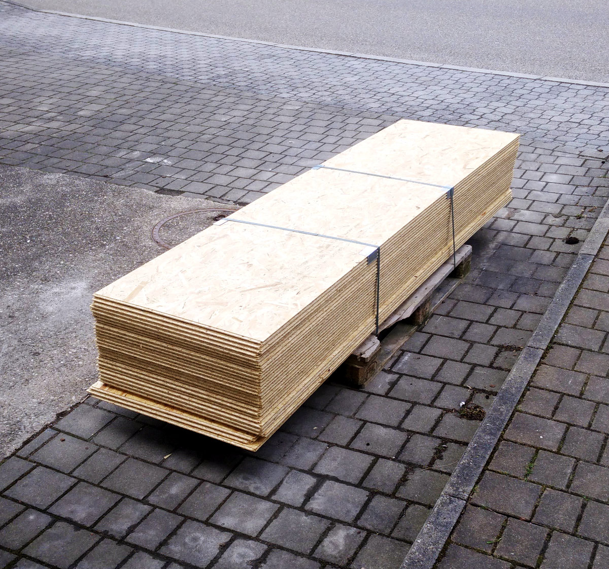 Rechnen wir weiter. OSB hat ein spezifisches Gewicht von 600kg pro Kubikmeter. Für meinen Stapel ergibt sich damit eine Masse von knapp 365kg. Und diese 365kg haben nach der ganzen Hochtrage-Aktion eine potentielle Energie (m*g*h) von nur 21,45 Kilojoule - zum Vergleich: eine 100g-Tafel Schokolade bringt es auf das Hundertfache (knapp über 2000 kJ).