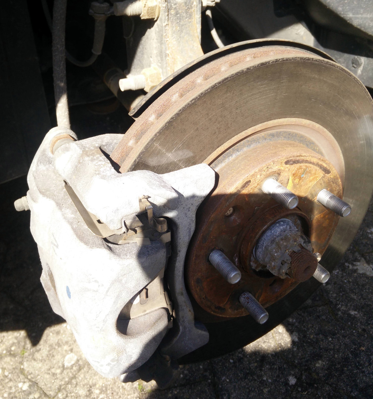 Die Bremsscheiben und auch die Beläge sehen aus, als wären sie gerade mal ein wenig eingelaufen, vielleicht 100km oder 500km. So hätte ich das bei meinem Corsa zumindest gesehen. Aber die hier hat - seit ich meinen Leaf habe - garantiert niemand getauscht. Und ich vermute fast, davor auch niemand. Die sind also über 50000km alt - da hatte ich beim Corsa schon fast Verschleißmaß erreicht und ans Wechseln gedacht.