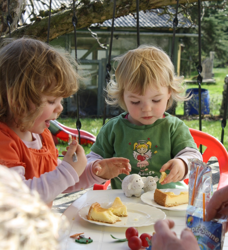 Im Bild füttert die Paula ein paar Porzellanschafe mit Käsekuchen, während Emma lieber sich selber füttert.
