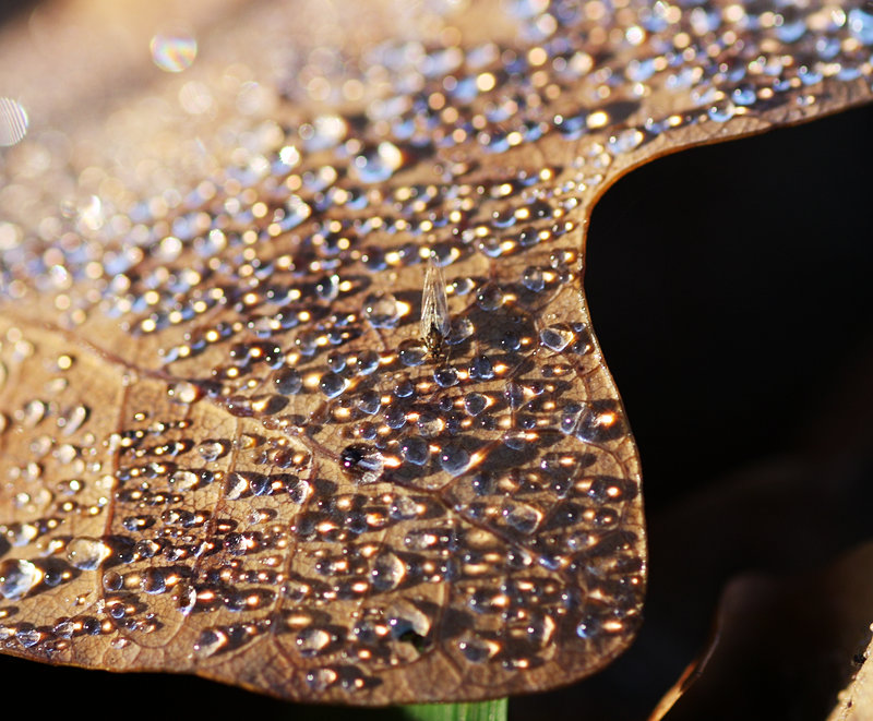 Oder nochmal Tautropfen, diesmal mit Fliegenfotobombe in der Bildmitte