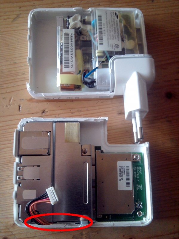Am Anfang steht zur Reparatur beziehungsweise Wiederbelebung das Aufbrechen des Airport Express. Der ist “Designed by Apple in California” und somit eigentlich nicht zum Öffnen vorgesehen. Deshalb braucht man entweder ein Bastelmesser und sehr viel Geduld oder einen Dremel. Aufgepasst an der Stelle neben der LED, da hier die Kabel vom eigentlichen WLAN-Teil zum Netzteil gehen. Hier darf nicht zu tief geflext werden!