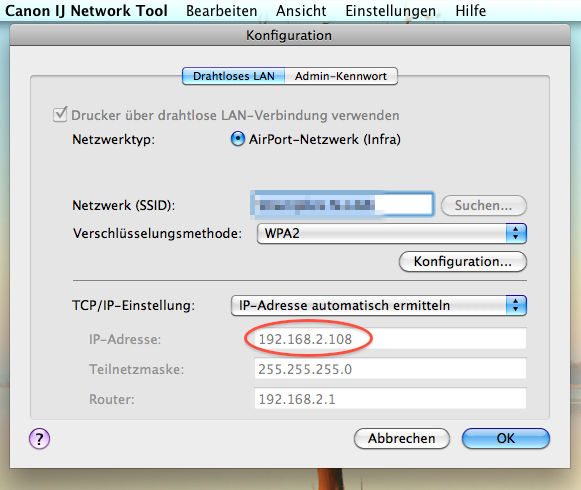 Es geht aber auch anders: man schnappe sich entweder den Router und guckt nach, welche IP der Drucker nun hat. Oder man nimmt eins der vielen unsäglichen (weil wie Fremdkörper aussehende) Tools von Canon, nämlich das Canon IJ Network Tool, und guckt damit nach, was Sache ist.