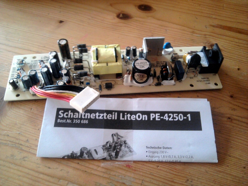 Vom alten Netzteil habe ich mir den Platinenstecker ausgelötet und die gleichfarbigen Adern miteinander verbunden; dasselbe am Schaltnetzteil.