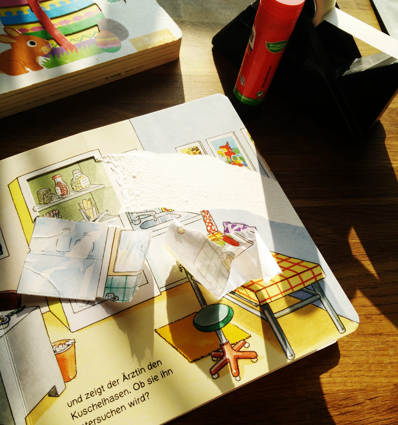 Zum Papa-Dasein gehört auch, dass man wieder flickt, was die Kids zerstören. Zum Beispiel ist das Jüngste gerade ein wahrer Vandale, was Kinderbücher mit so neckischen Türen zum Aufklappen angeht: